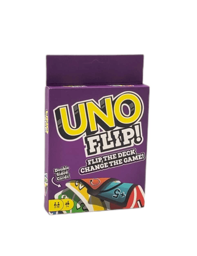 UNO FLIP! És una versió renovada del clàssic UNO, amb una baralla de doble cara. L’objectiu continua sent quedar-se sense cartes abans que els altres, usant cartes especials com Roba cinc i Tots perden el torn. La carta FLIP permet canviar entre el costat “clar” i el “fosc” de la baralla, afegint noves regles i emoció al joc. No oblidis cridar “UNO” quan et quedi una carta!